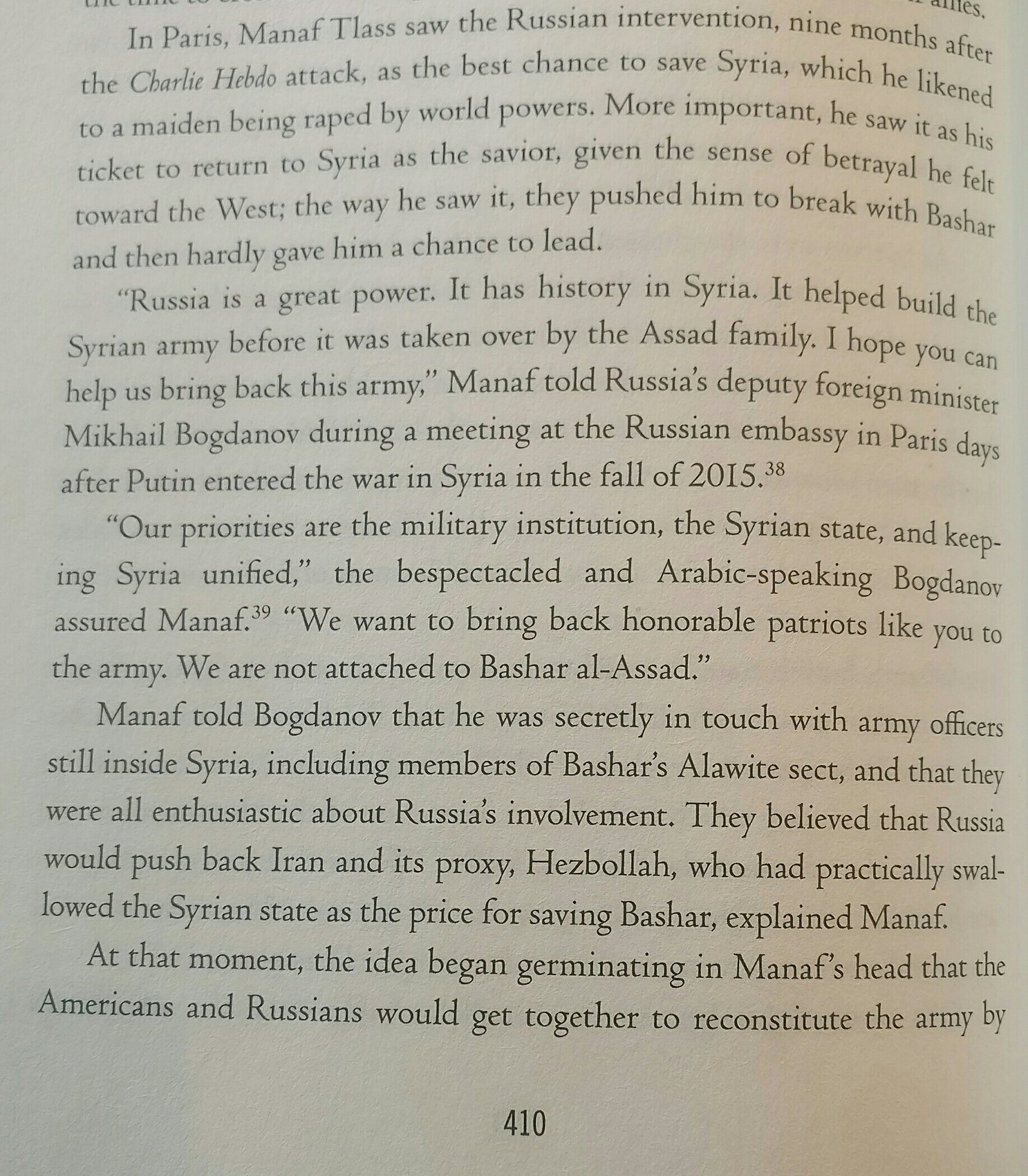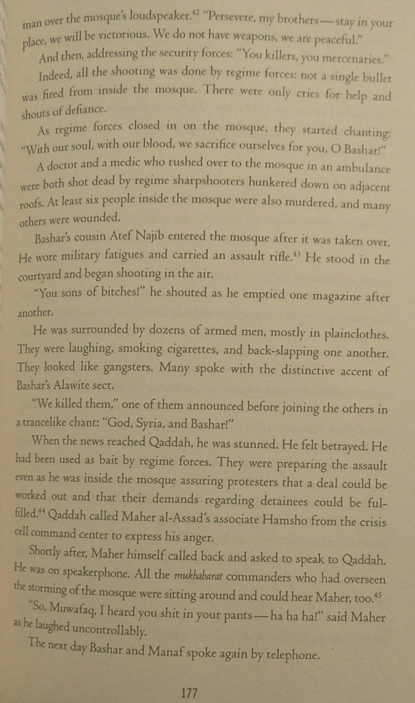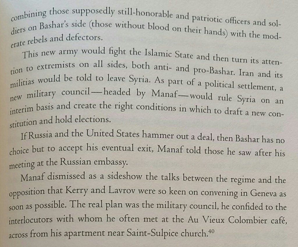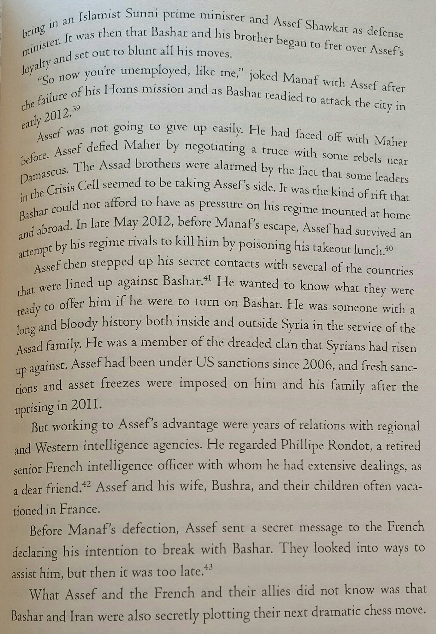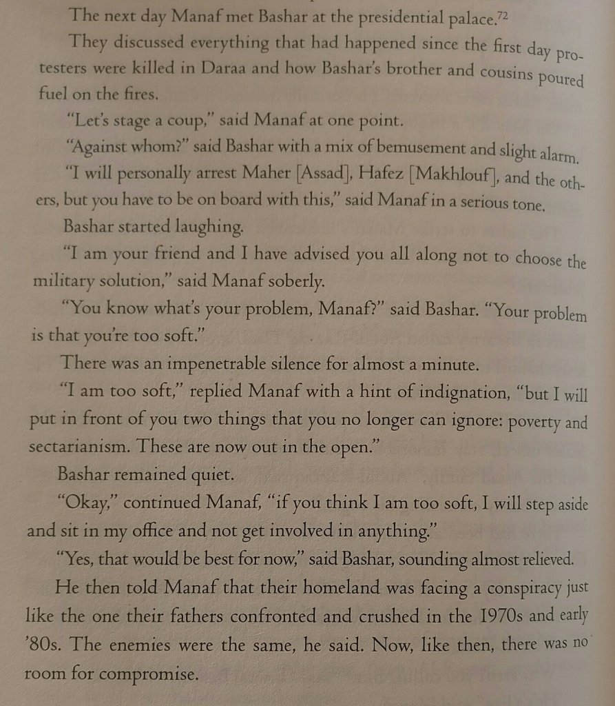 Manaf’s defection takes place ~300 pages in. But the book continues for another 160 or so pages, describing the developments of the Syrian conflict until late 2018. If I had any critique of the book, I’d say it was trying to tell 2 different stories and ended up being a bit long: Manaf Tlass’s insider account of how the Assad regime destroyed Syria, and a general history of the Syrian conflict. It could have ended in mid-2012 with Manaf’s defection coupled with the collapse of Kofi Annan’s peace plan, with the rest in a follow-up perhaps.