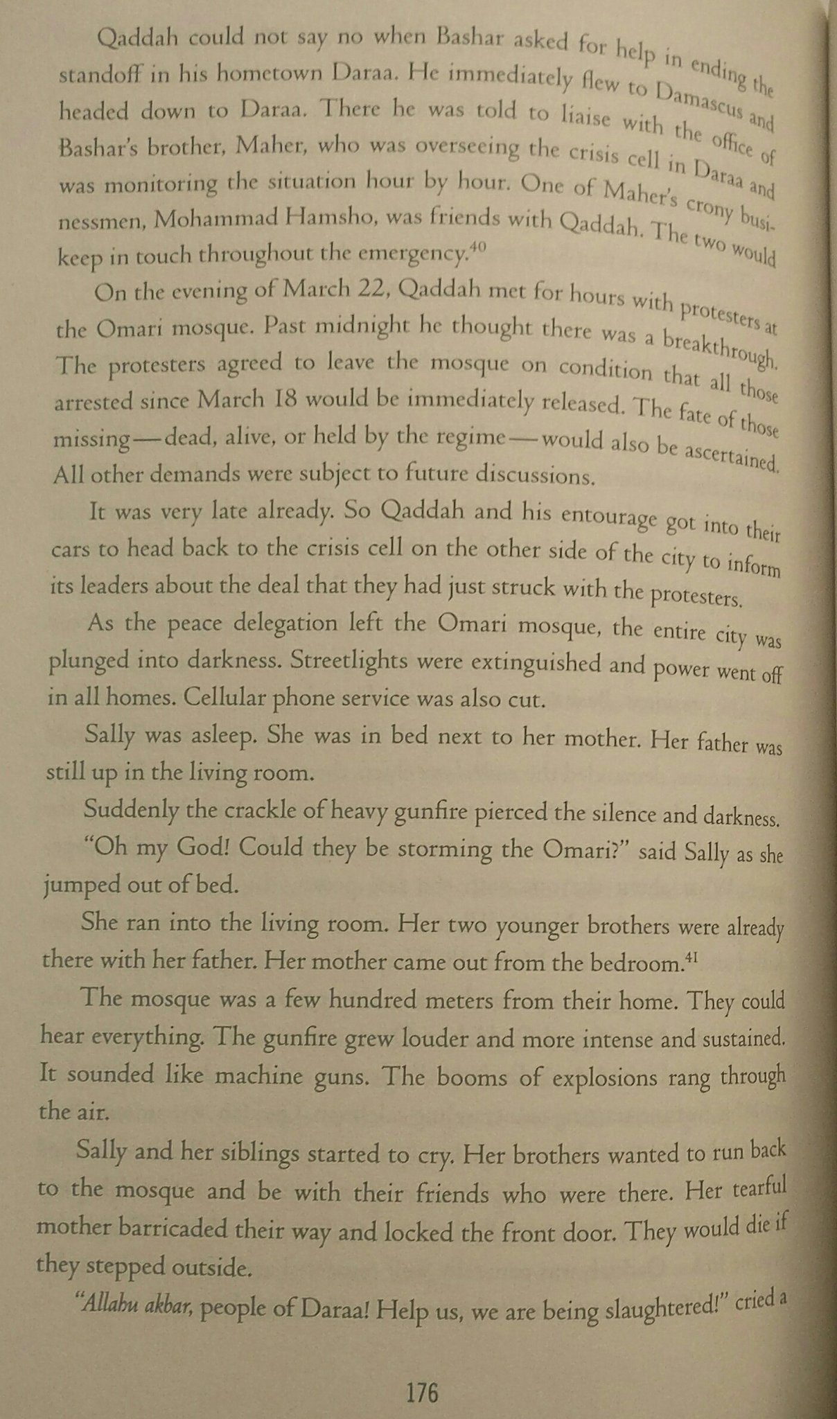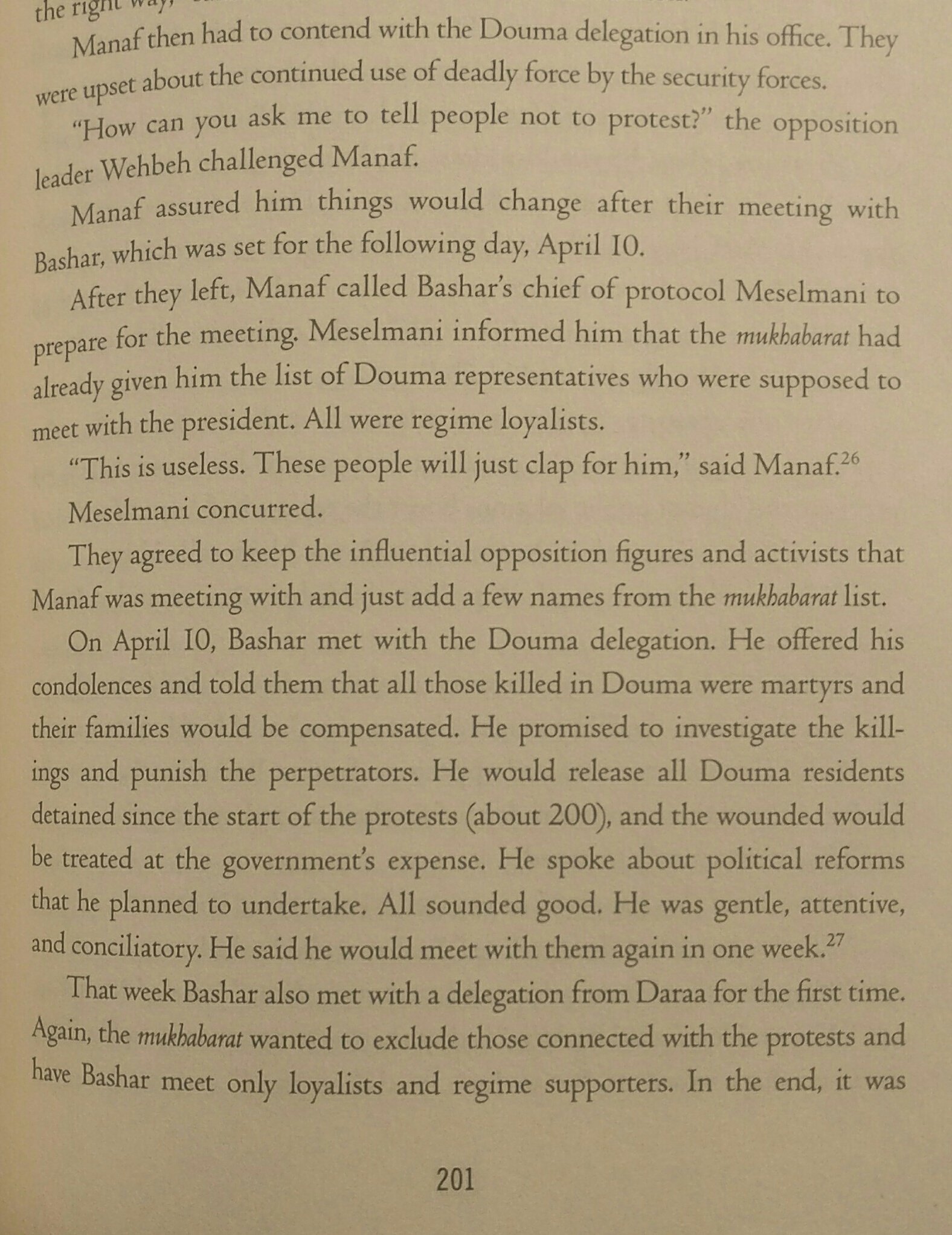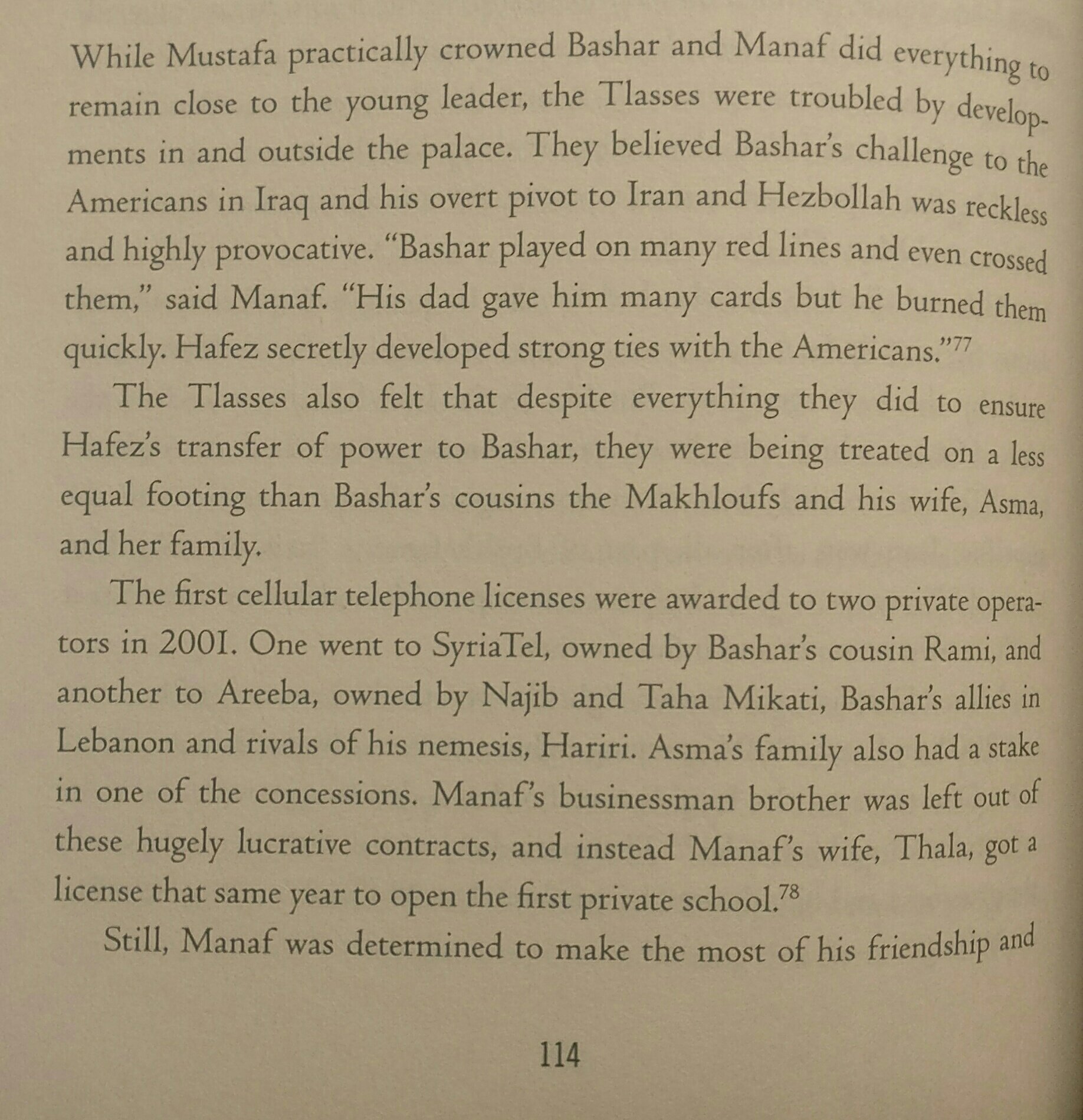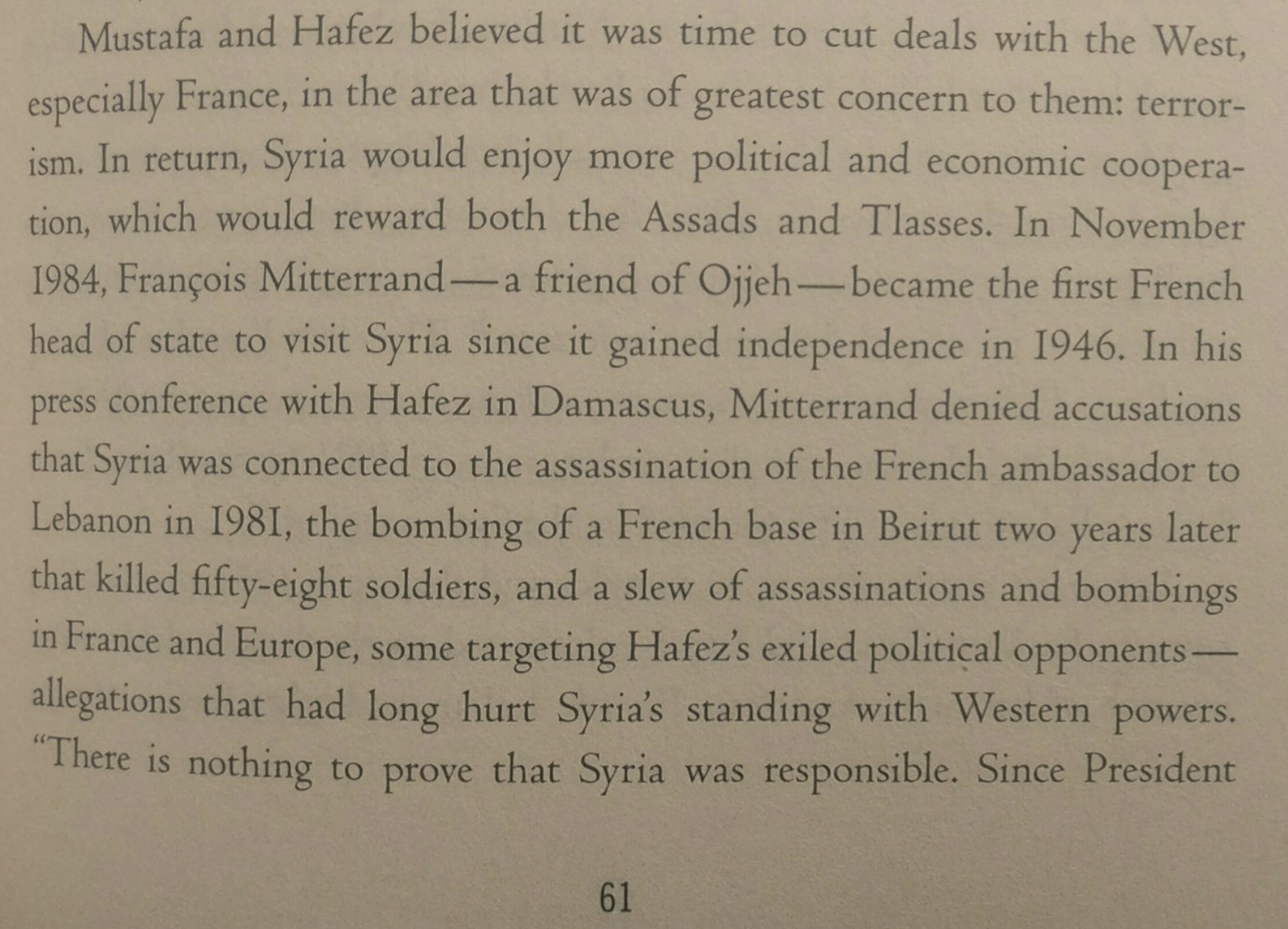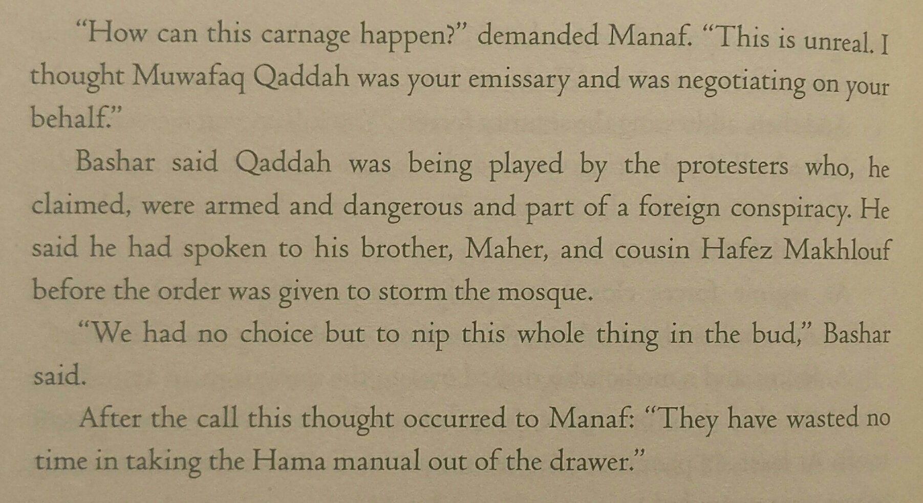 Manaf’s defection takes place ~300 pages in. But the book continues for another 160 or so pages, describing the developments of the Syrian conflict until late 2018. If I had any critique of the book, I’d say it was trying to tell 2 different stories and ended up being a bit long: Manaf Tlass’s insider account of how the Assad regime destroyed Syria, and a general history of the Syrian conflict. It could have ended in mid-2012 with Manaf’s defection coupled with the collapse of Kofi Annan’s peace plan, with the rest in a follow-up perhaps.