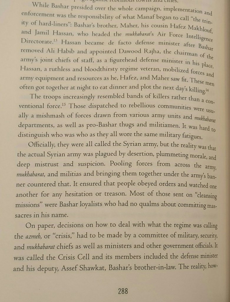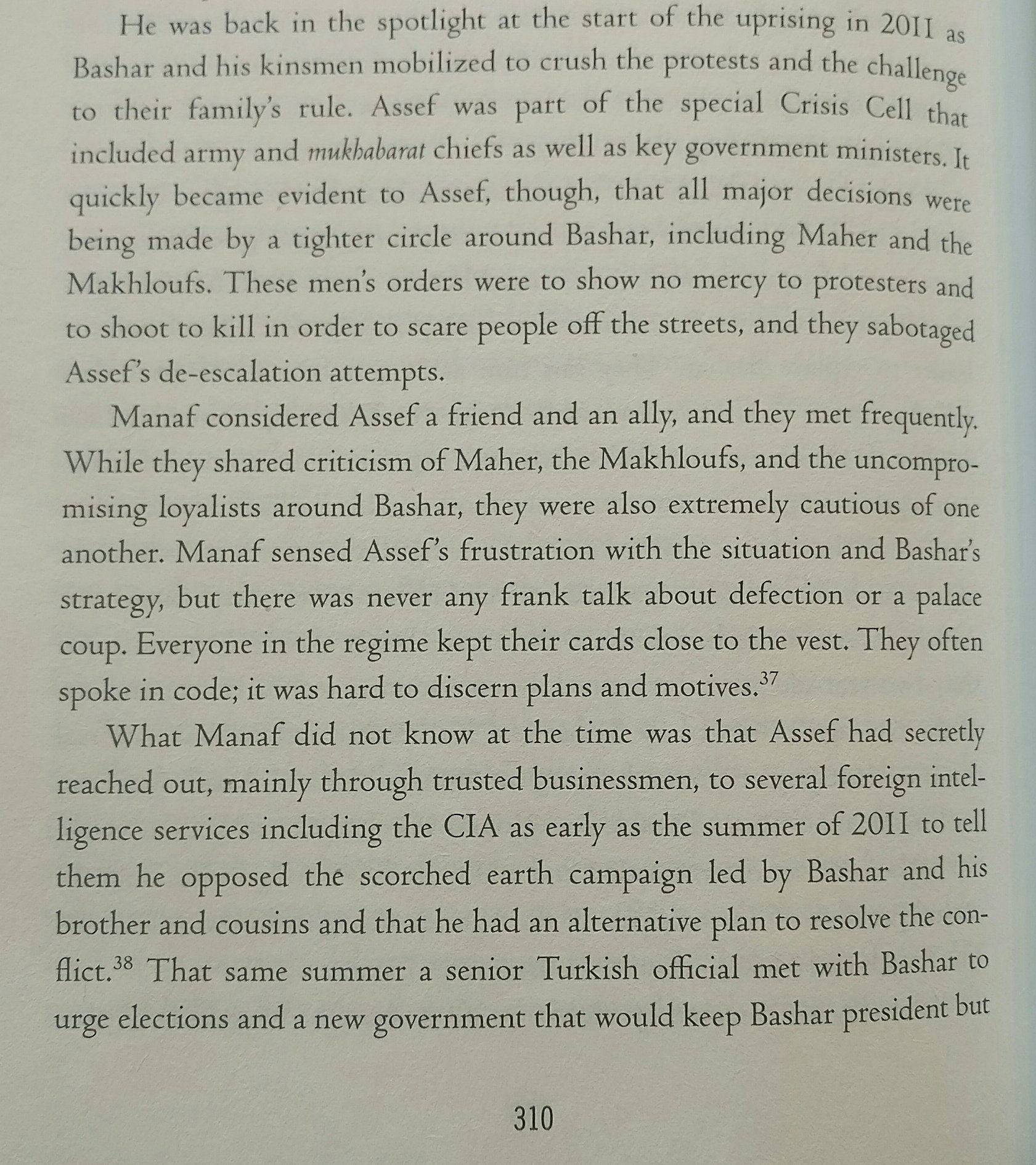 I just finished “Assad Or We Burn the Country” by Sam Dagher. It’s an interesting and captivating read. It gives an insider account (via Manaf Tlass) of the regime’s decision making in the first few months and years, which is its main draw. There’s also some on-the-ground activists whose activities it follows to balance out that perspective.