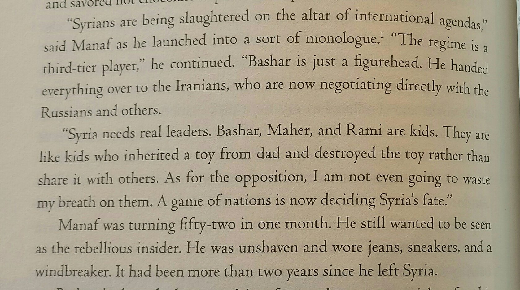Of course, I’m biased as I already follow Syria pretty closely and so I didn’t learn too much in the last 160 pages. People not as familiar with events there might have a different take. And to be fair, it did follow Manaf’s activities in exile too, which I hadn’t been familiar with prior.