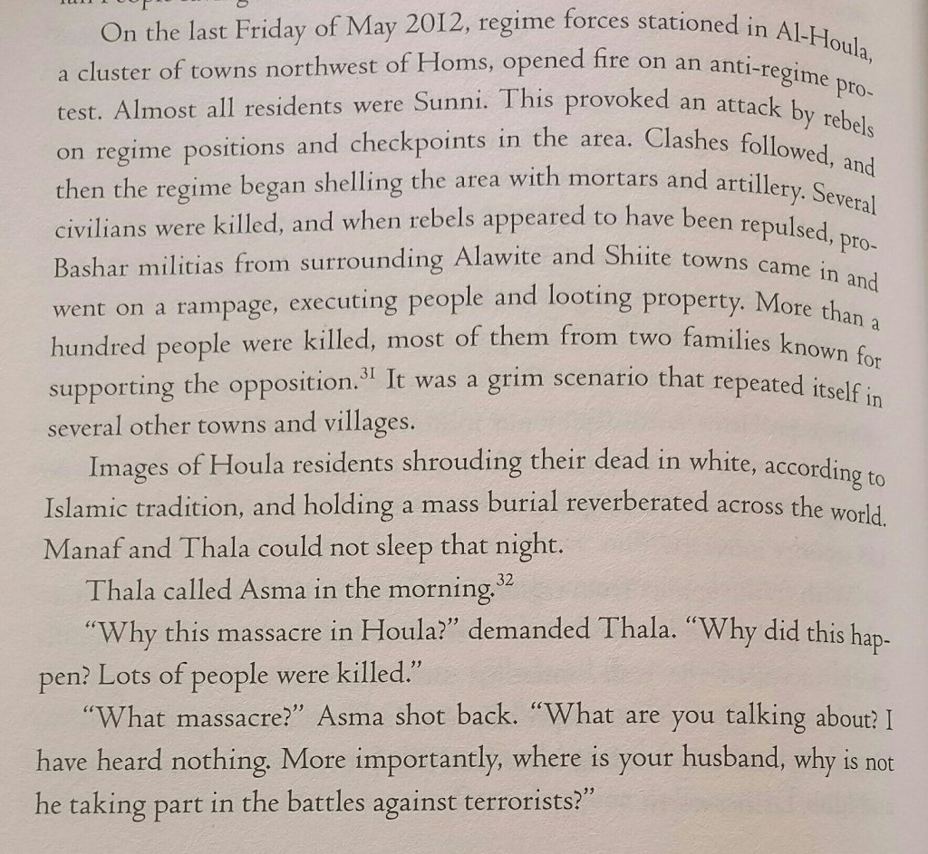 When Manaf’s wife confronted Asma al-Assad about the Houla massacre and she simply feigned ignorance.